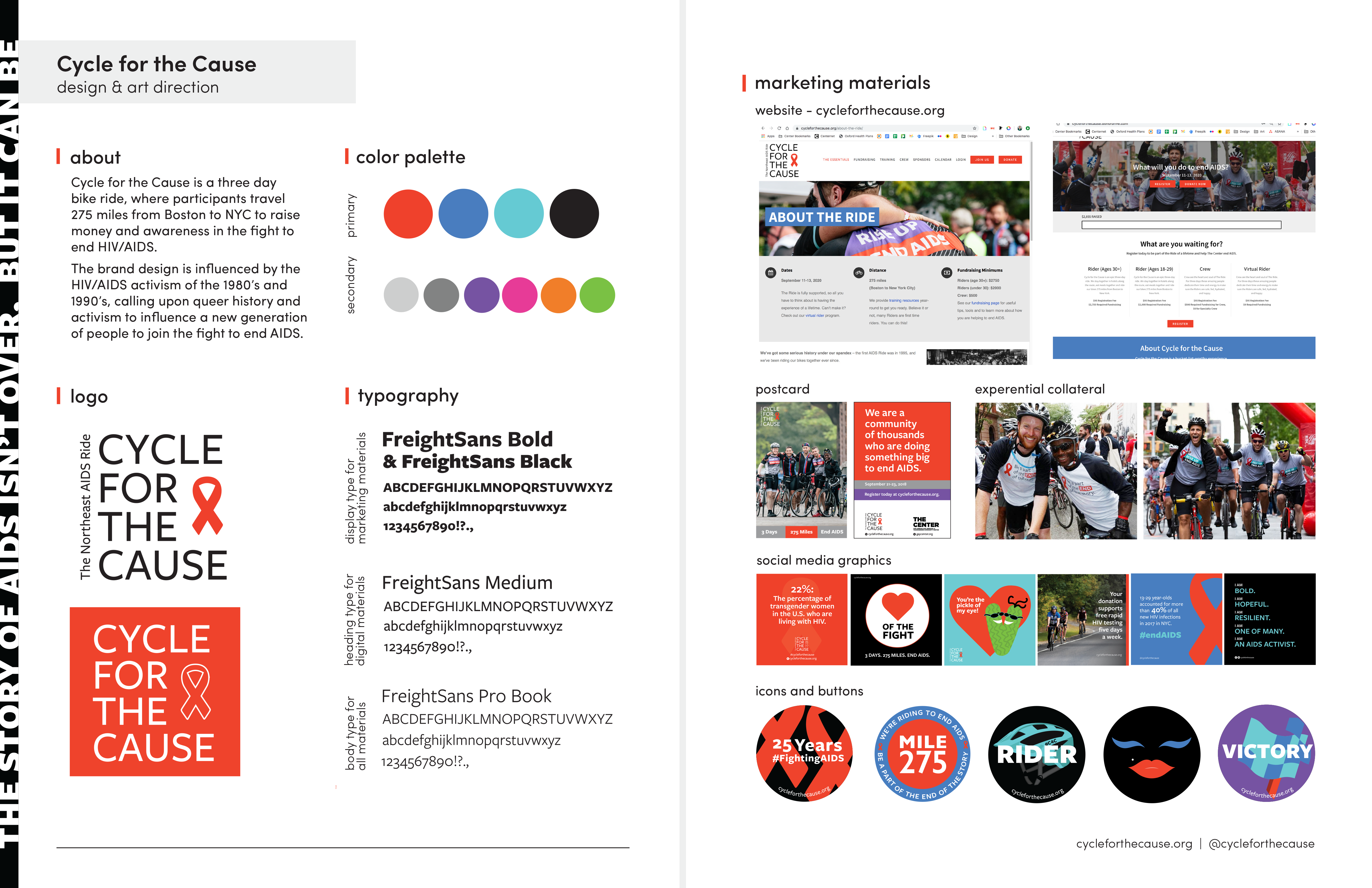 Cycle for the Cause is a three day bike ride - participants travel 275 miles to raise money and awareness in the fight to end HIV/AIDS. + The brand design is influenced by the HIV/AIDS LGBTQ activism of the 80s/90s, refrencing queer history as a guiding force and influence on a new generation to join the fight to end AIDS.